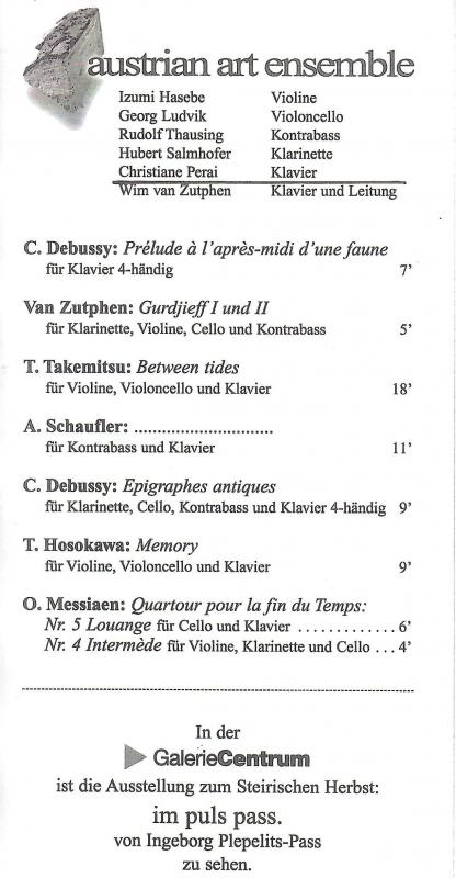 27.10.05 austrian art ensemble "Abendmusiken", Leitung Doz. Prof. Wim van Zutphen, am Klavier Prof. Christiana Perai, KUG. Galerie Centrum, 19:00.