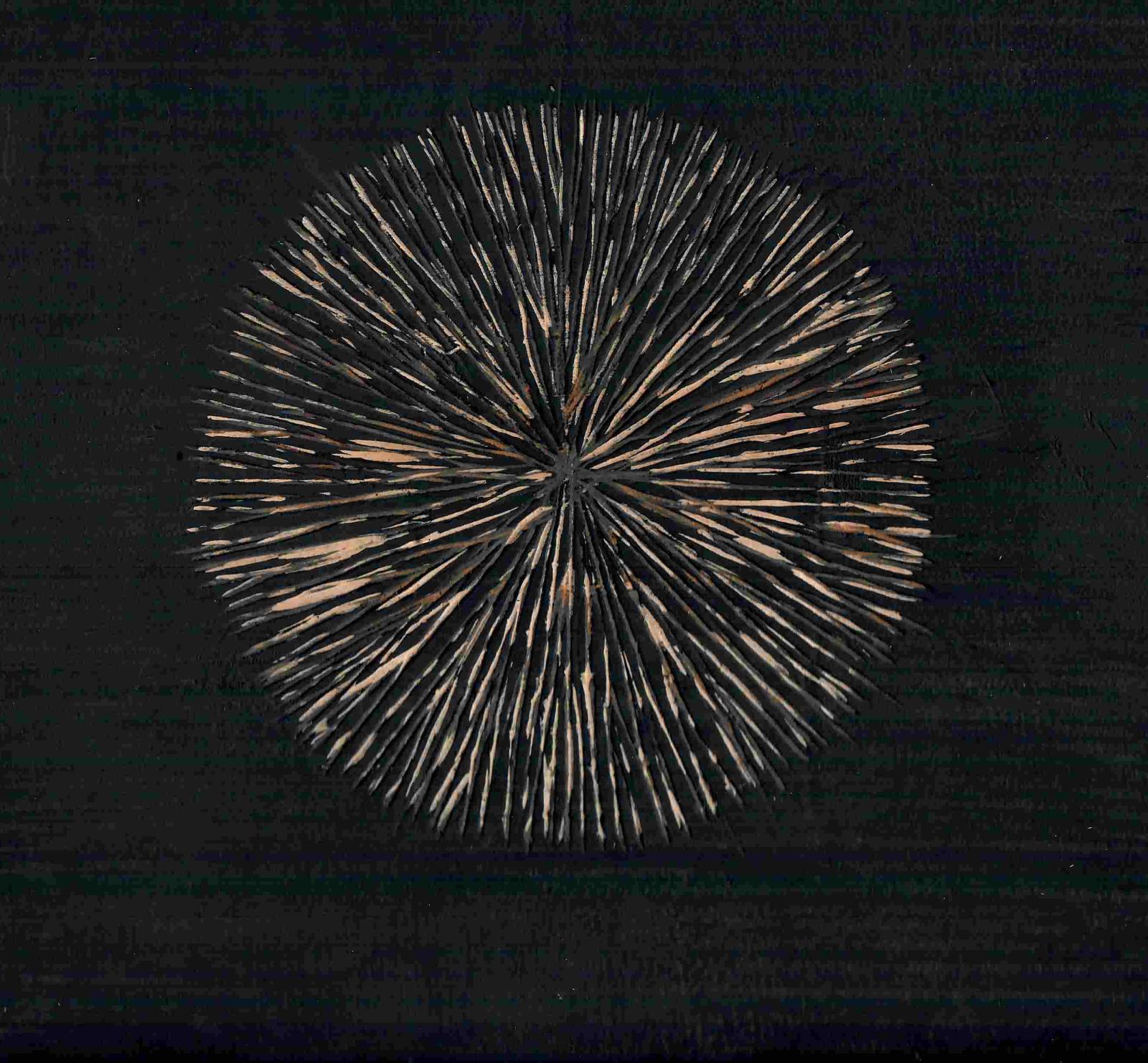 Hier die Holzplatte, die durch schwarze Druckfarbe noch eingefärbt in schönem Kontrast, lebendig, irgendwie strahlend/funkelnd. Könnte den Titel "Funkelnder Stern" tragen. Die Schnittveränderungen sehr reizvoll. Holzfarbe "leuchtet" aus dem Schwarz. Schön als gescannte Arbeit. Überlegung, die Platte in diesem Zustand zu erhalten. Lieber einen ganz neuen Stern produzieren. Das Thema Stern gefällt mir für diesen Jahresbeginn. NEU auch als eine Phase nach der Ausstellung in der PLUE23 zum 80er, in der ich wesentliche Werke meiner gesamten Werkzeit zusammengestellt hatte.
