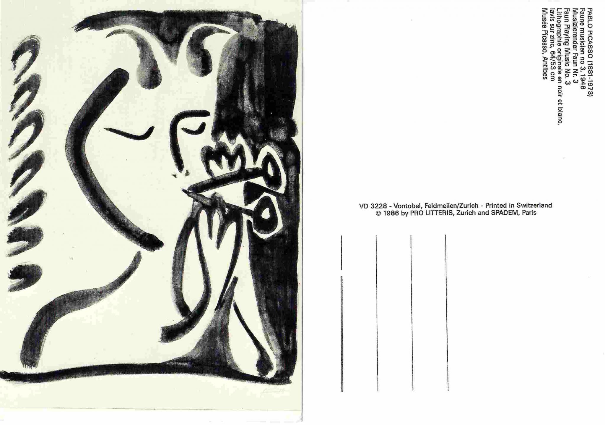 Eine Lieblingskarte von mir, vielleicht meine Liebste! Die Leichtigkeit von Picasso, das Spielerische, kann so nachvollziehen durch meine Tuscharbeiten ganz früh, noch "unverdorben" damals, sicher (auch?) in Musikbegleitung, deshalb so leicht meine 3 .... und hier Picassos "Musizierender Faun" ....